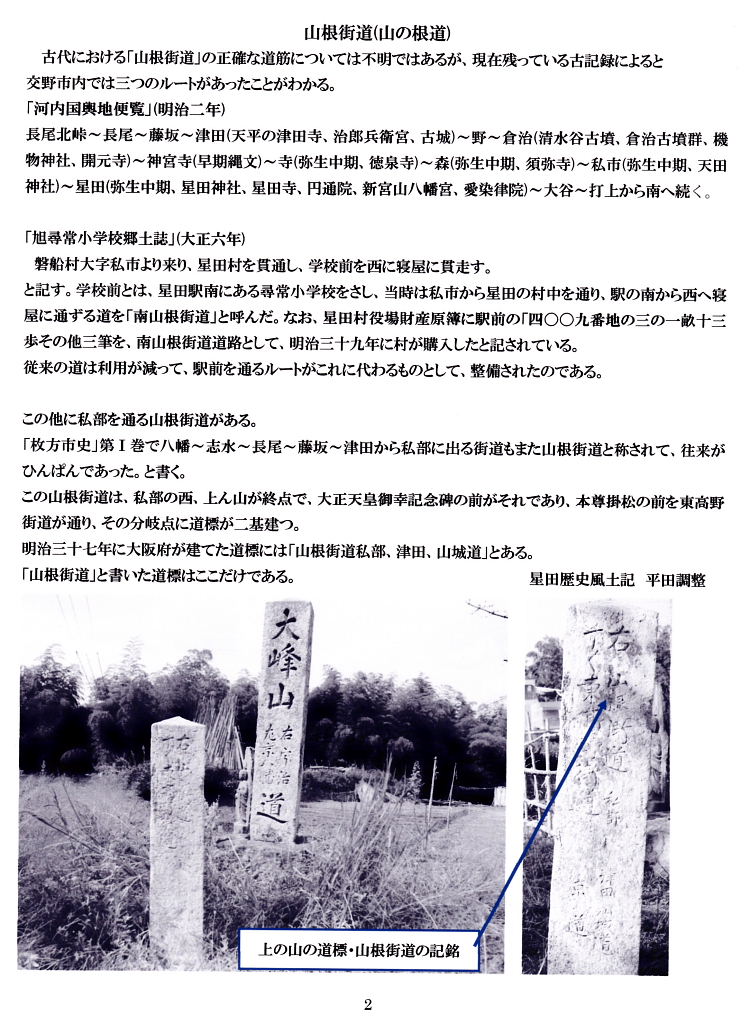 古代における「山根街道」の正確な道筋については不明ではあるが、現在残つている古記録によると、交野市内では三つのルートがあったことがわかる。 「河内国輿地便覧」(明治二年) 長尾北峠~長尾~藤坂~津田(天平の津田寺、治郎兵衛宮、古城)~ 野~倉治(清水谷古墳、倉治古墳群、機物神社、開元寺)~ 神宮寺(早期縄文)~ 寺(弥生中期、徳泉寺)~ 森(弥生中期、須弥寺)~私市(弥生中期、天田神社)~星田(弥生中期、星田神社、星田寺、円通院、新宮山八幡宮、愛染律院)~ 大谷~打上から南へ続く。 「旭尋常小学校郷土誌」(大正六年) 磐船村大字私市より来り、星田村を貫通し、学校前を西に寝屋に貫走す。と記す。学校前とは、星田駅南にある尋常小学校をさし、当時は私市から星田の村中を通り、駅の南から西へ寝屋に通ずる道を「南山根街道」と呼んだ。なお、星田村役場財産原簿に駅前の「四〇〇九番地の三の一畝十三歩その他三筆を、南山根街道道路として、明治三十九年に村が購入したと記されている。 従来の道は利用が減つて、駅前を通るルートがこれに代わるものとして、整備されたのである。 この他に私部を通る山根街道がある。 「枚方市史」第I巻で八幡~志水~長尾~藤坂~津田から私部に出る街道もまた山根街道と称されて、往来がひんぱんであつた。と書く。 この山根街道は、私部の西、上ん山が終点で、大正天皇御幸記念碑の前がそれであり、本尊掛松の前を東高野街道が通り、その分岐点に道標が二基建つ。 明治三十七年に大阪府が建てた道標には「山根街道私部、津田、山城道」とある。 「山根街道」と書いた道標はここだけである。 星田歴史風土記 平田調整 |