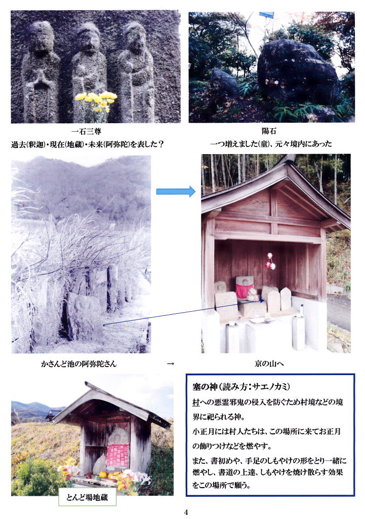 | 寺の野道の辻に、祀られている。中世末の墓仏で阿弥陀の小像で、 祭祀場所がトンド場と呼ばれる小正月の火祭り場であることから、サエノカミとも考えられる。 また、書初めや手足のしもやけの形をとり一緒に燃やし、 書道の上達、しもやけを焼き散らす効果をこの場所で願った。 |